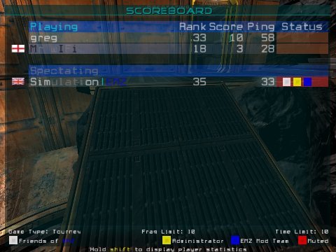 The scoreboard also shows additional information about each player. To the left of the name is the player's chosen country flag. At the right of each line is a block which shows the player's skin colour and also indicates with coloured boxes whether the player is an administrator (gold), clan member (silver), EMZ member (blue) or is currently muted (red).