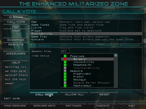 With EMZ the server admin can control which items (weapons, health, armour, powerups) are available within a map and what their respawn times are after they have been picked up. For example, you may want to disable the berserk power-up and alter the armour respawn time to 60 seconds.